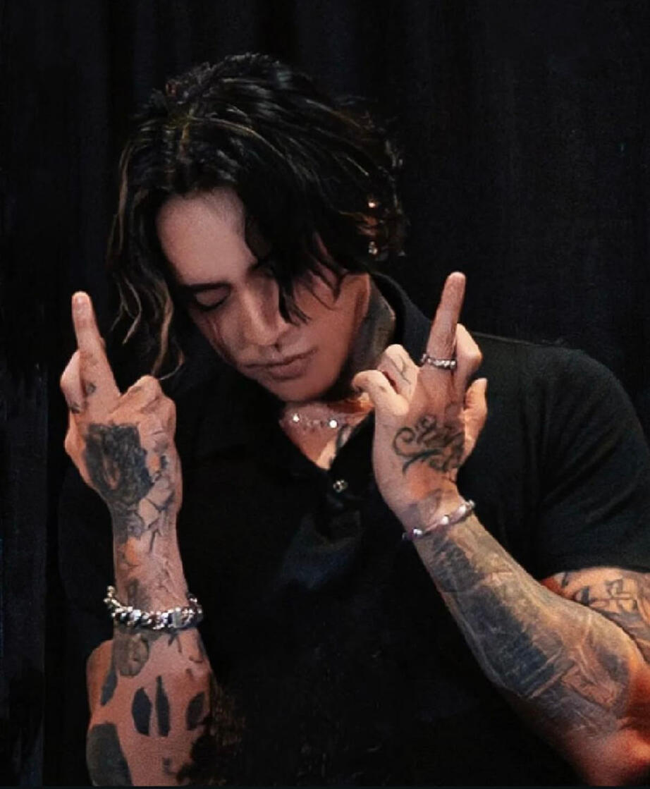 tattoos. A double cross marks his left jugular in ink. Chrono and necromantic motifs crawl up his right leg. Geometric patterns and fractals cover both arms in full sleeves along with various other smaller tattoos on his hands and fingers.